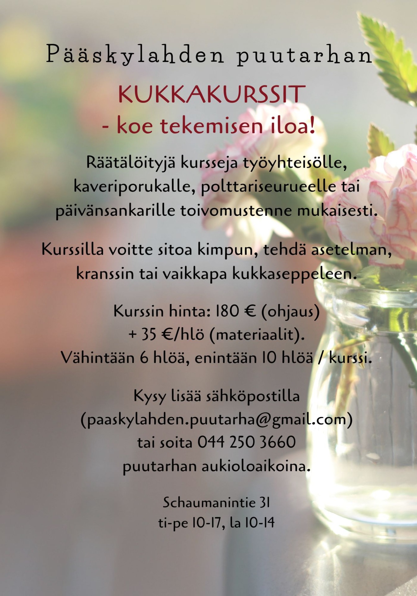 Kokoa oma porukka, miettikää, mitä haluatte tehdä ja ottakaa yhteyttä minuun, niin järjestetään teille teidän näköinen kukkatyöpaja.